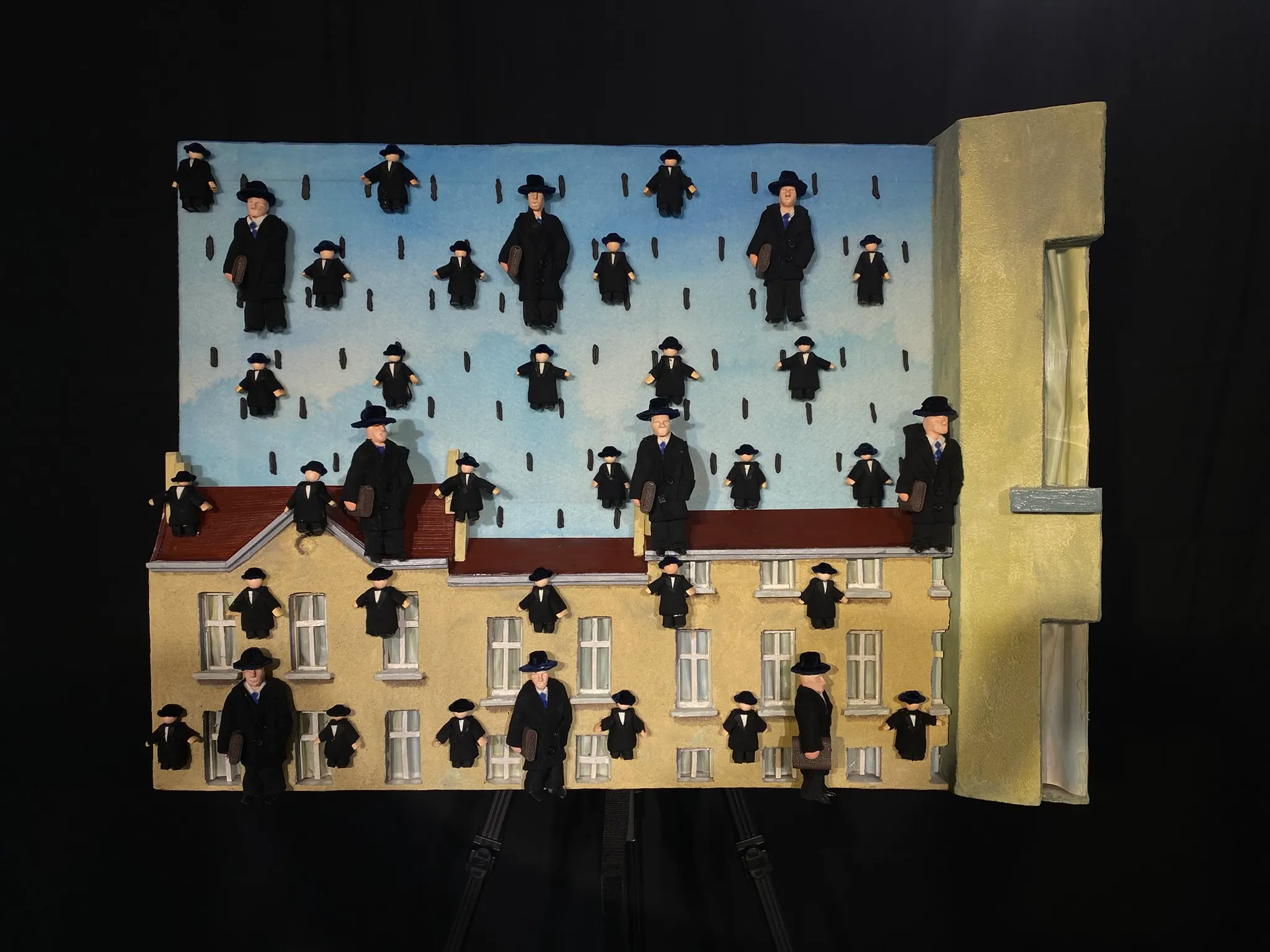중절모에 검정색 코트를 입고 한손에는 가방을 든 남성들이 하늘에서 쏟아져 내린다. 각각의 무표정한 남성들은 건물과 건물 사이에 가득 채워져 검은 비가 내리는 것처럼 보인다. 남성들은 모두 동일한 것처럼 보이지만 자세히 보면 얼굴과 손의 방향 등이 제각각이다. 붉은 지붕의 건물에 있는 수많은 직사각 창들은 흰색 커튼으로 가려져 내부가 보이지 않는다. 그림의 코트차림은 실제로 마그리트가 즐겨 입은 복장이었다고 한다.