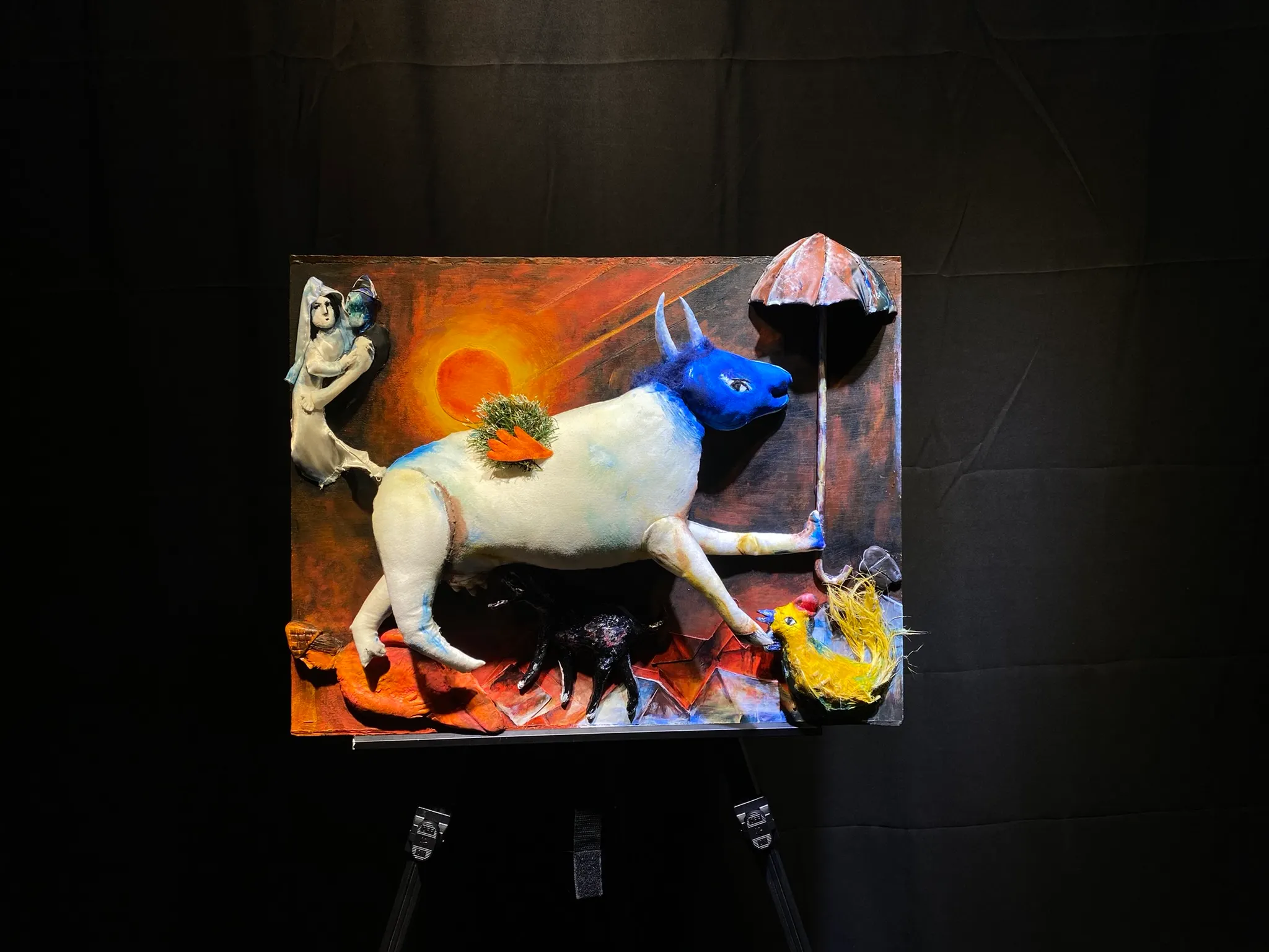 1941년 나치의 유대인 학살을 피해 샤갈은 가족과 함께 미국에 정착한다. 3년 뒤 1944년 아내 벨라는 바이러스 감염으로 갑작스럽게 사망하고, 이 충격으로 샤갈은 거의 1년 동안 그림을 그릴 수 없었다. 이후 유럽으로 여행을 떠나 새로운 인연을 만나며 그림에 대한 열정과 삶의 활력을 불어 넣었다. 당시 연인 연인에게 영감을 얻어 작업한 작품이 <파라솔을 든 소>이다.