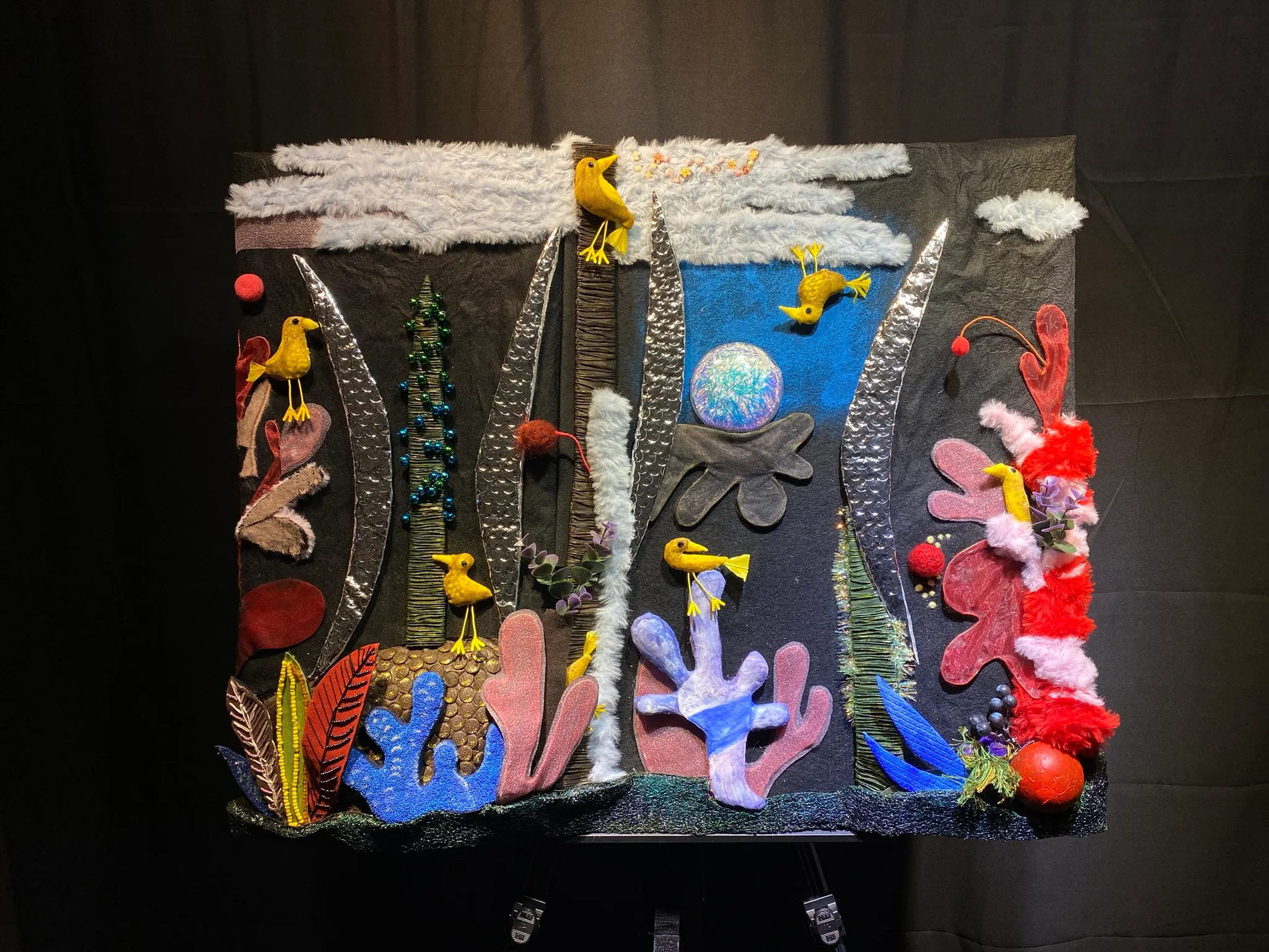 짙은 어둠이 깔린 숲 속에 보름달이 밝게 떠올라 주변을 밝히고 있다. 붉은 산호 모양의 나무가 양 끝에 서 있고, 하단에는 끝이 뾰족하거나 둥근 키가 작은 식물들이 있다. 작은 식물들 위로 길쭉하고 거대한 초승달 모양의 잎사귀가 달빛에 반사되어 빛나고 있다. 그 잎사귀들 사이로 노란 새 일곱 마리가 원을 그리듯 자리 잡고 있다.