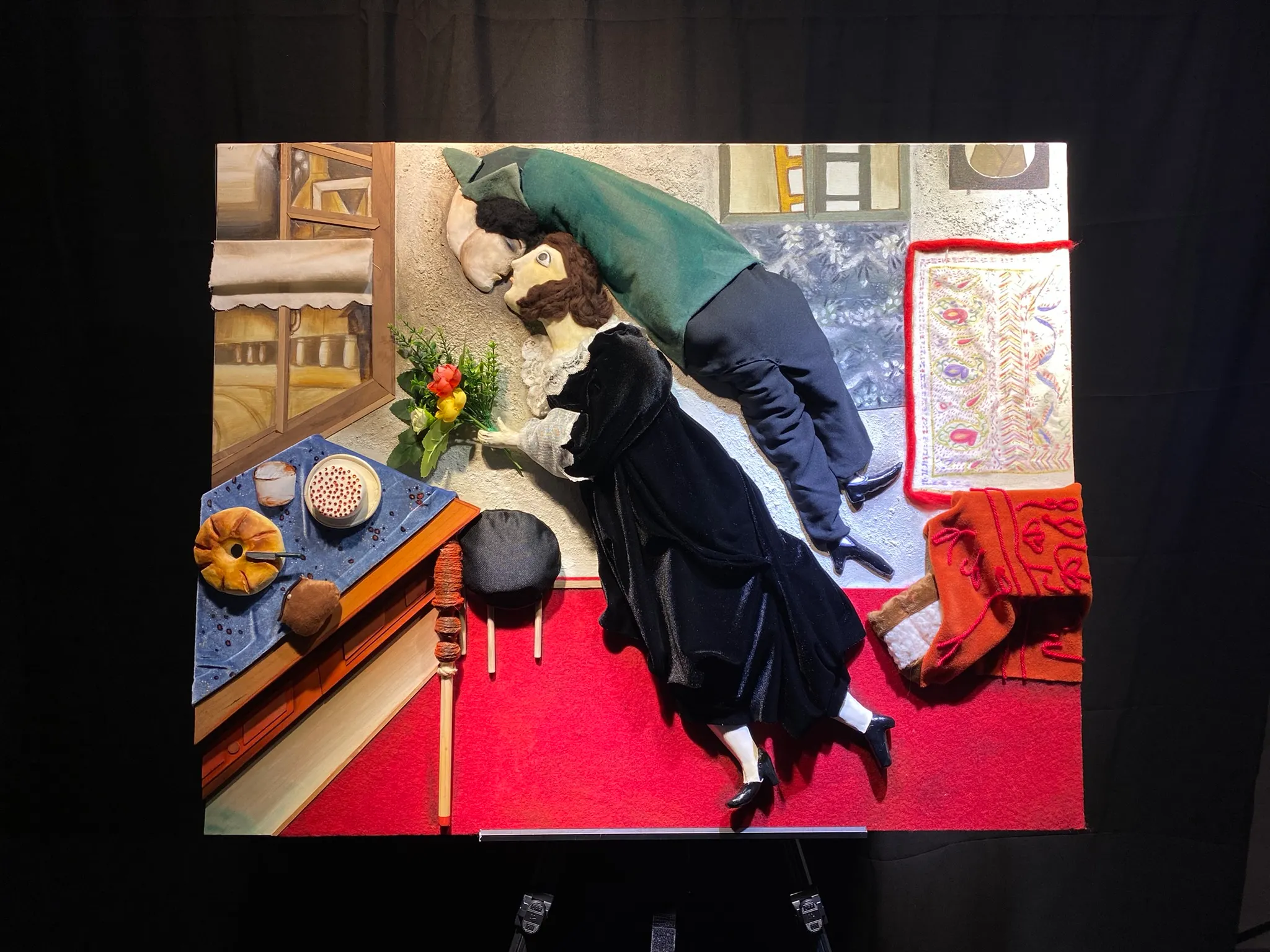 불타는 듯 강렬하게 내리쬐는 태양 아래, 푸른 머리의 흰 소가 한 발로 파라솔을 들고 있다. 파라솔 아래에는 황금빛을 내는 수탉이 흰 소의 젖을 먹고 있는 검은 송아지를 바라보고 있다. 이 암소의 꼬리가 위로 올라가 있으며, 꼬리 상단에는 면사포에 흰 드레스를 입은 여성이 유대인 복장에 키파를 쓴 남성과 애틋하게 껴안고 있다.